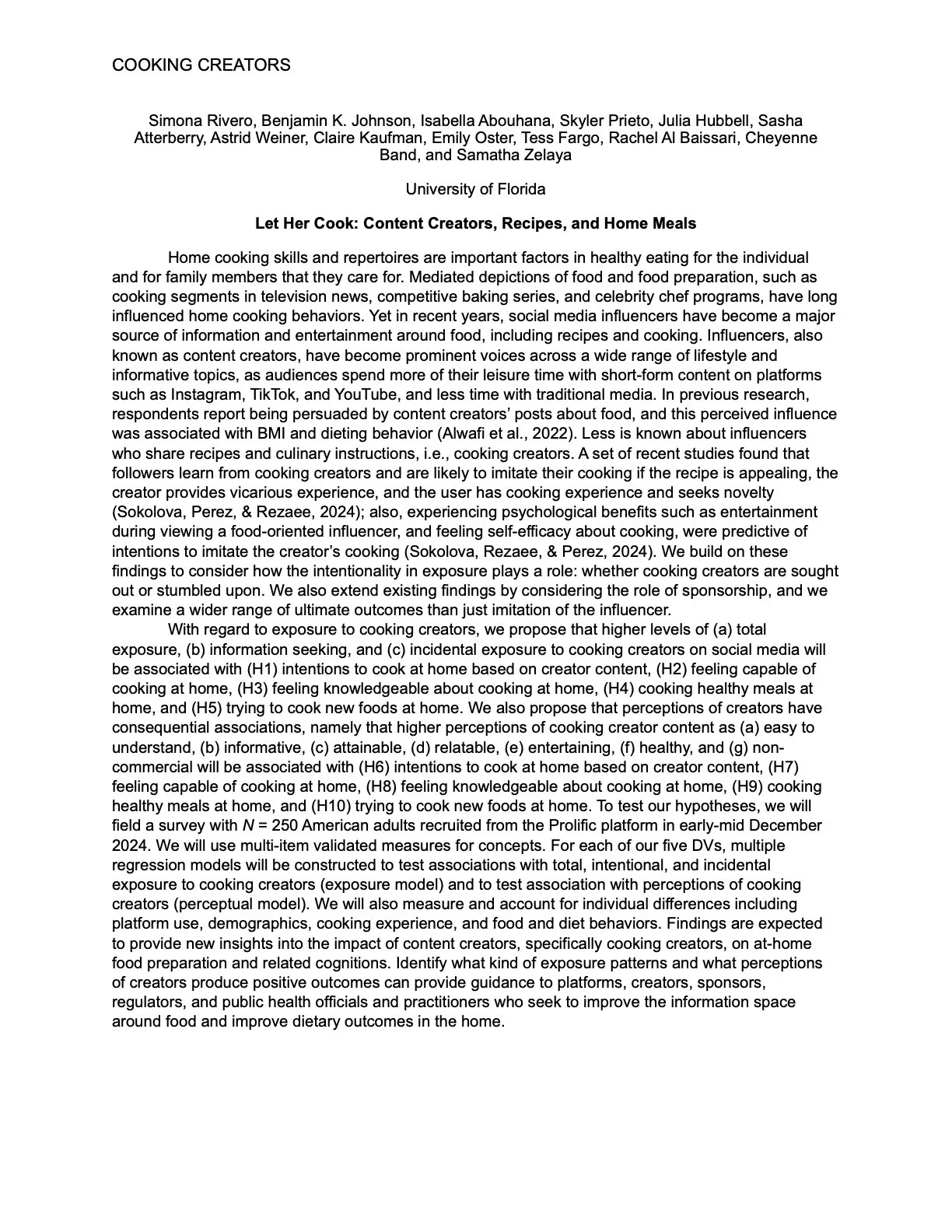 Rivero, S., Johnson, B. K., Abouhana, I., Prieto, S., Hubbell, J., Atterberry, S., Weiner, A., Kaufman, C., Oster, E., Fargo, T., Al Baissari, R., Band, C., & Zelaya, S. (2025). Let her cook: Content creators, recipes, and home meals. Paper/Poster at The 8th Biennial D.C. Health Communication Conference, Washington D.C.